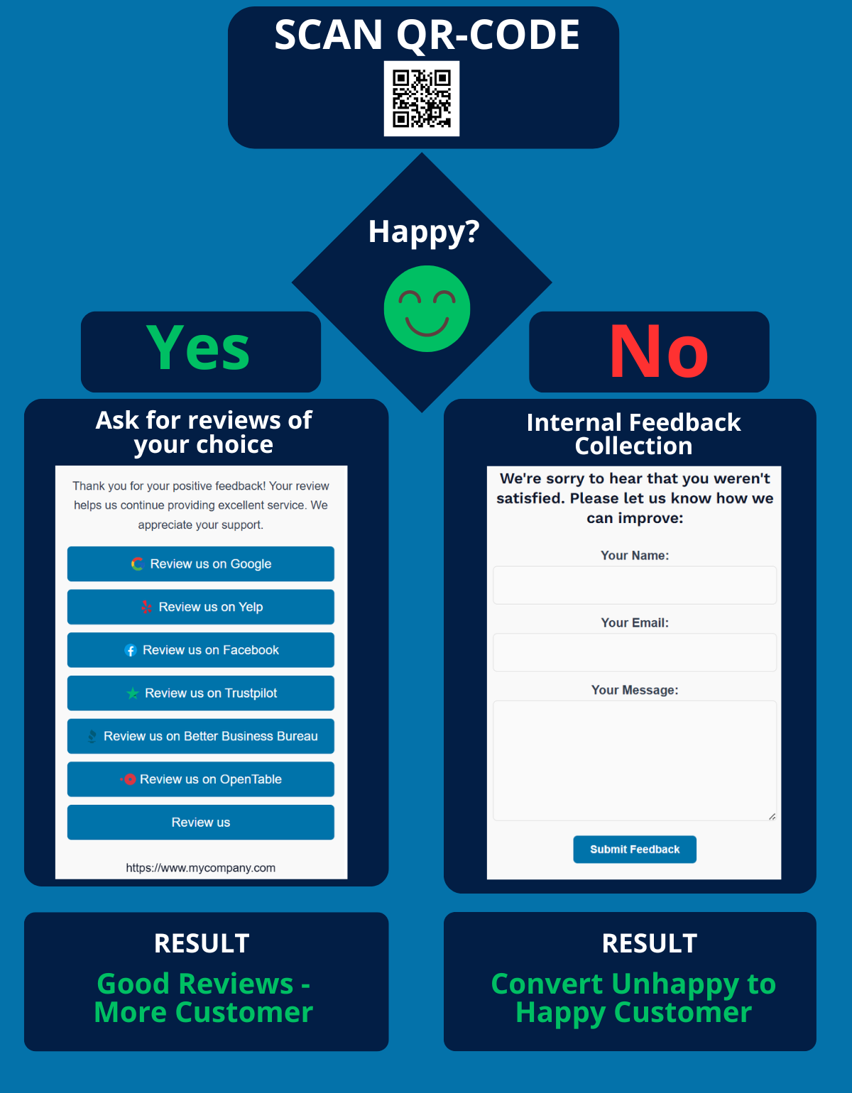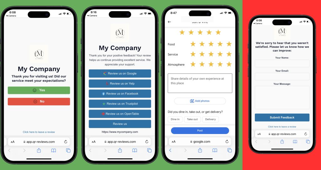 Our advanced QR code system collects both internal feedback and public reviews on sites like Google, Facebook, Tripadvisor, and more. Most Affordable Solution Available!