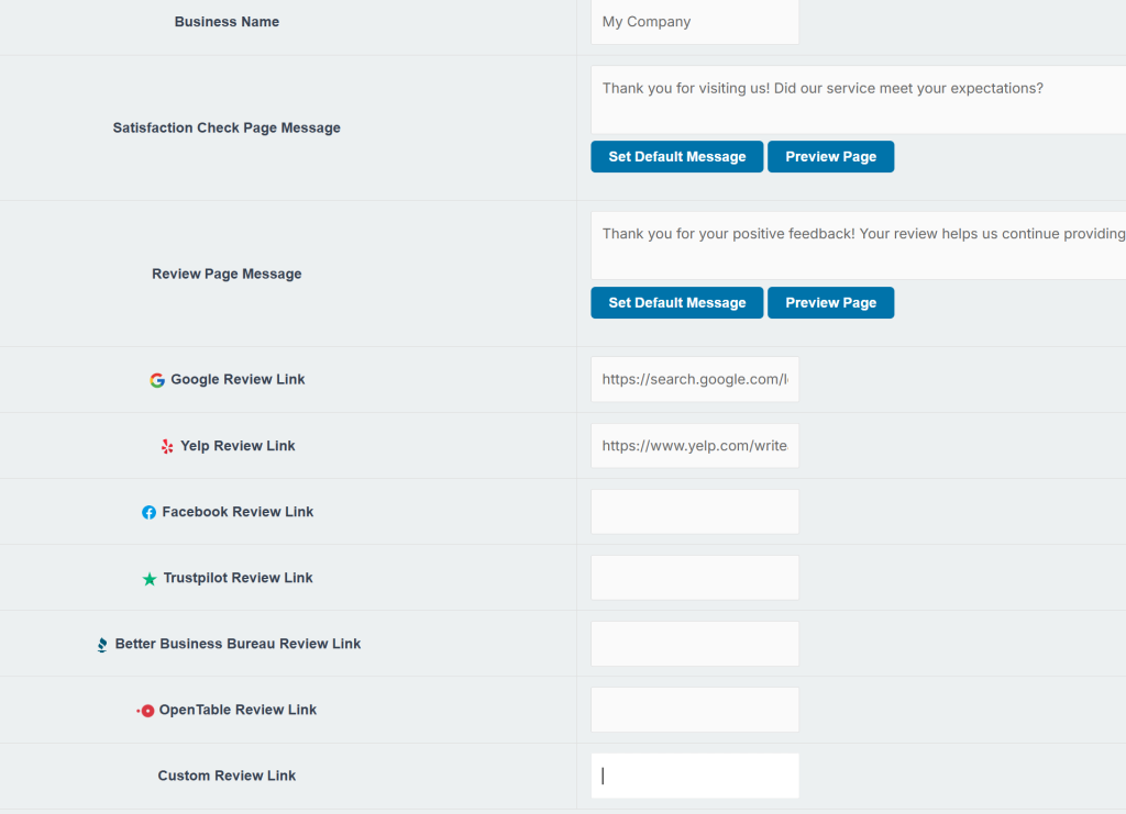 Set up your company name, custom message, and all the review links you want to request from customers—all in one place!